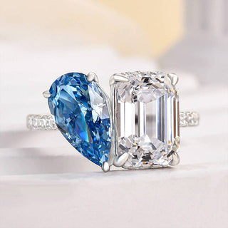5.5 CT Sky Blue Pear & Emerald Cut Diamond Toi Et Moi Hidden Halo Pave Engagement Ring